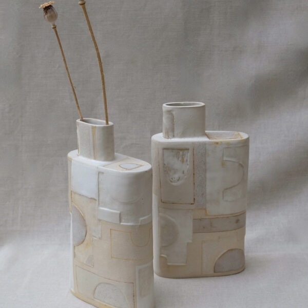 I am a ceramicist based at Dockyard Ceramic Studio in Woolwich. My practice involves hand-building stoneware clay forms. I then work on the surfaces using abstract mark-making techniques, including textures, mono-printing with colour slips and oxides, and relief carving, to develop multi-layered look. I have also created a series of standing stones and birds in with incised pattern