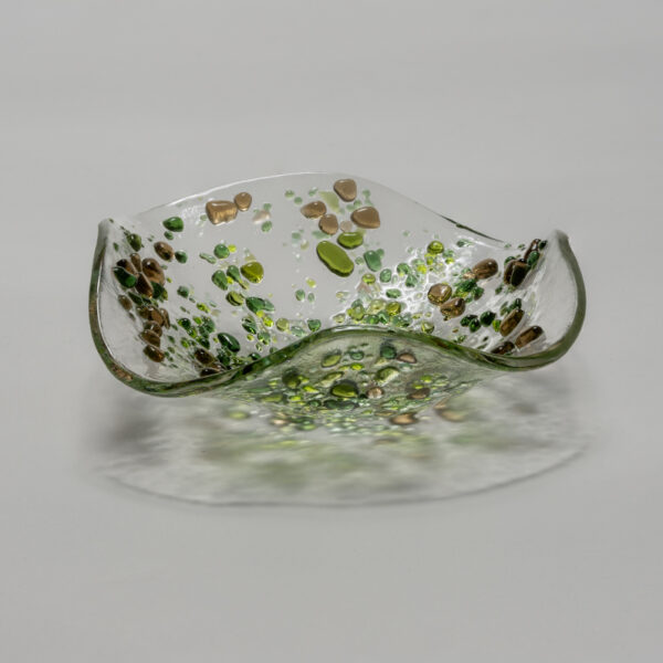 Sigi uses a range of forming techniques, using grains of glass frit and carefully considered designs; she anticipates how the glass will fuse and flow in the kiln. Judging the degree of melt is key; success depends on petrifying the glass at just the right moment. In different bodies of work Sigi exploits colour and no colour with crystalline textures. Sigi is inspired by nature.