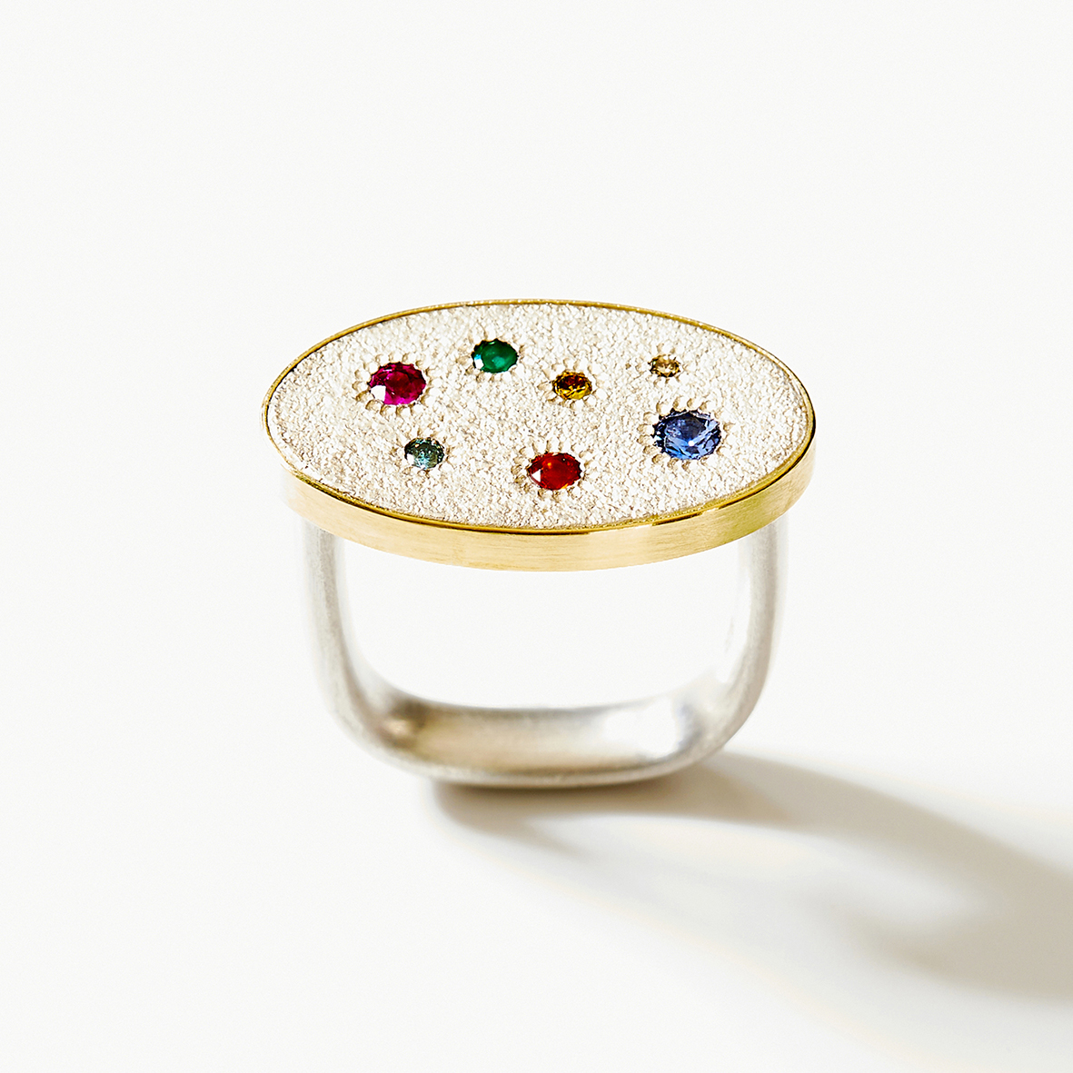 Tanja creates sculptural Silver and Gold jewellery with a colourful range of gemstones such as Opals Emeralds, Quartzes, Sapphires and sometimes a Meteorite lands as well.